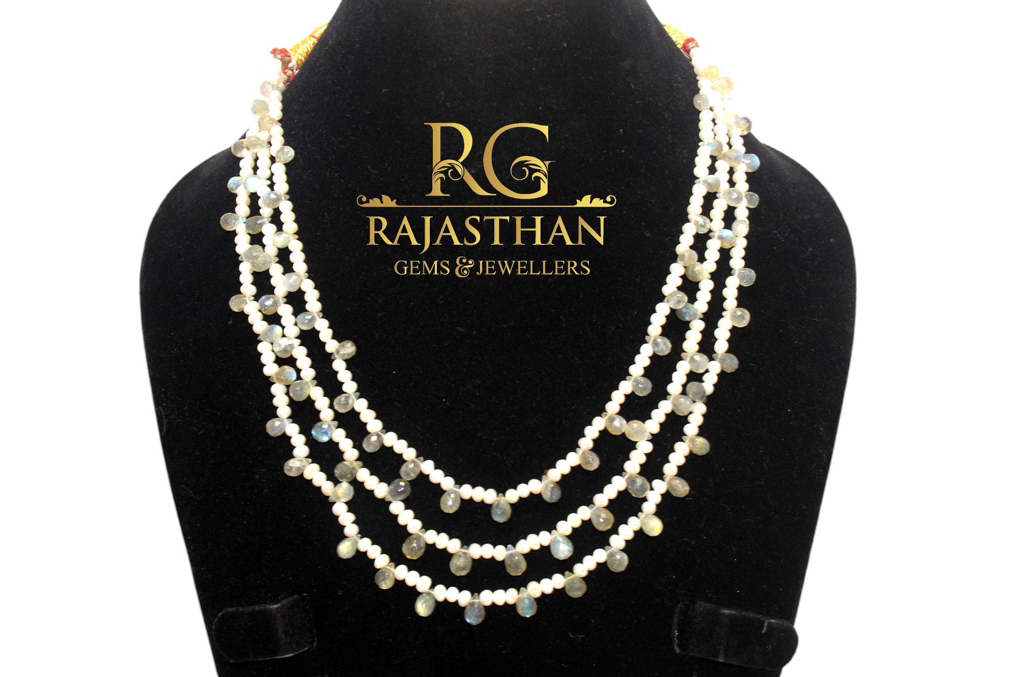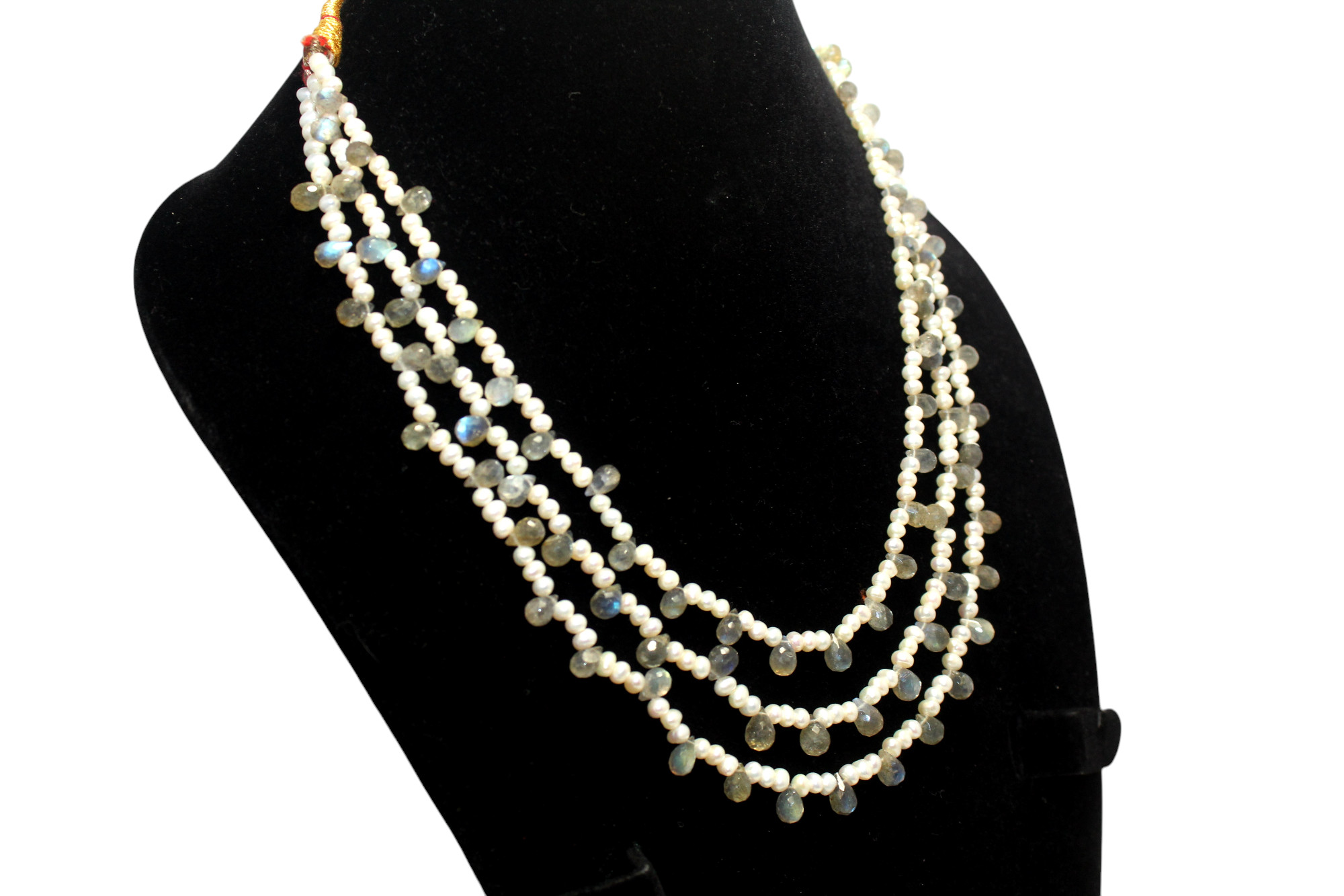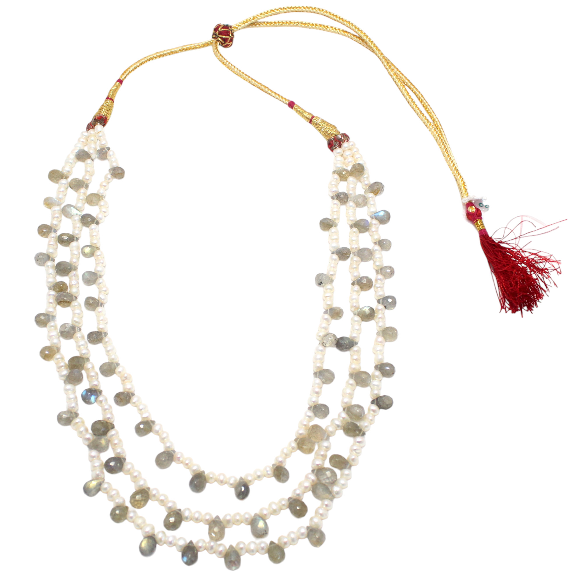 Rajasthan Gems Adjustable Necklace 3 Line Strand String Beaded Jewellery Women Natural Labradorite & Freshwater Pearl Gem Stone Beads Gift F669