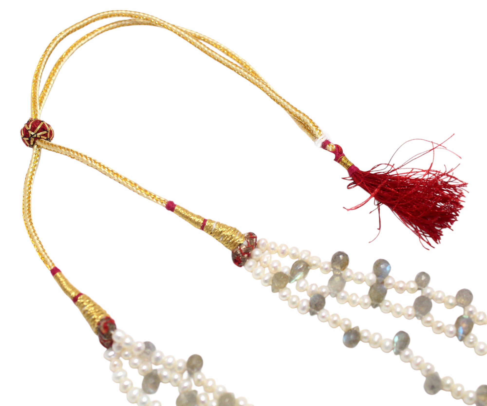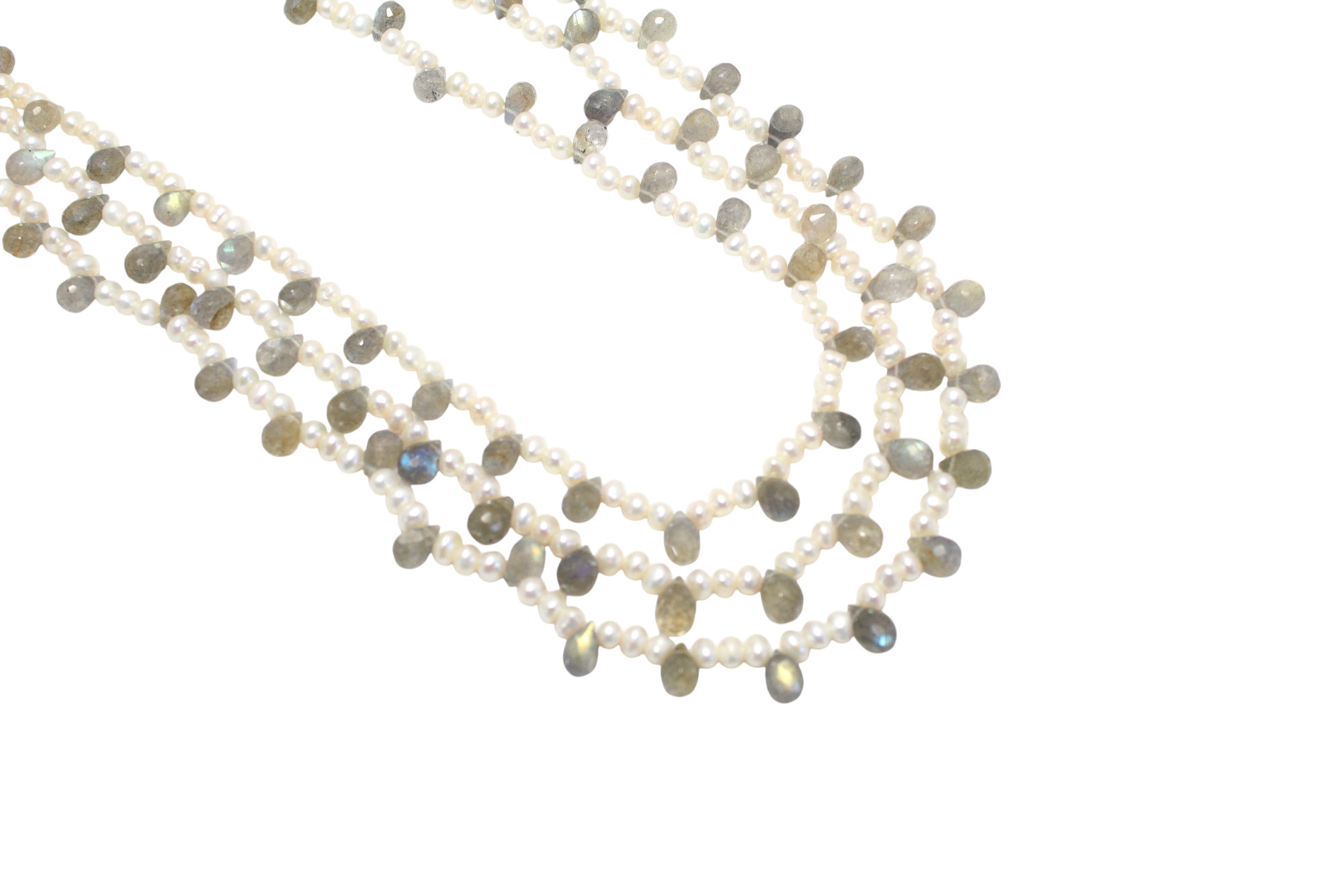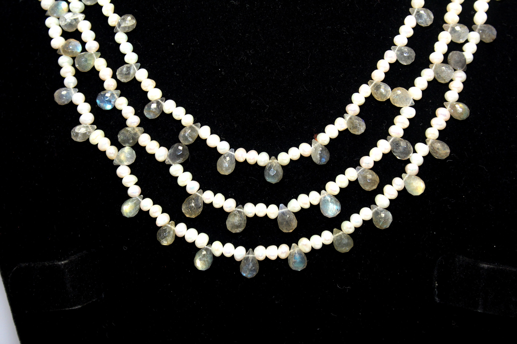 Rajasthan Gems Adjustable Necklace 3 Line Strand String Beaded Jewellery Women Natural Labradorite & Freshwater Pearl Gem Stone Beads Gift F669