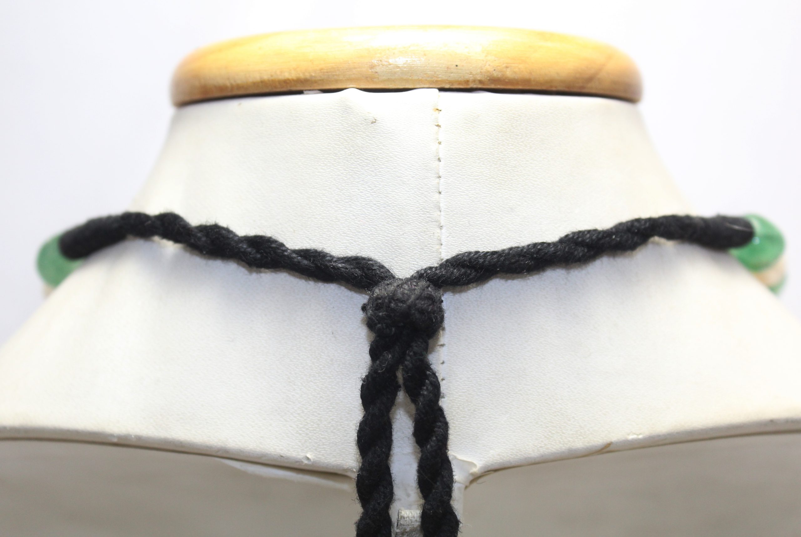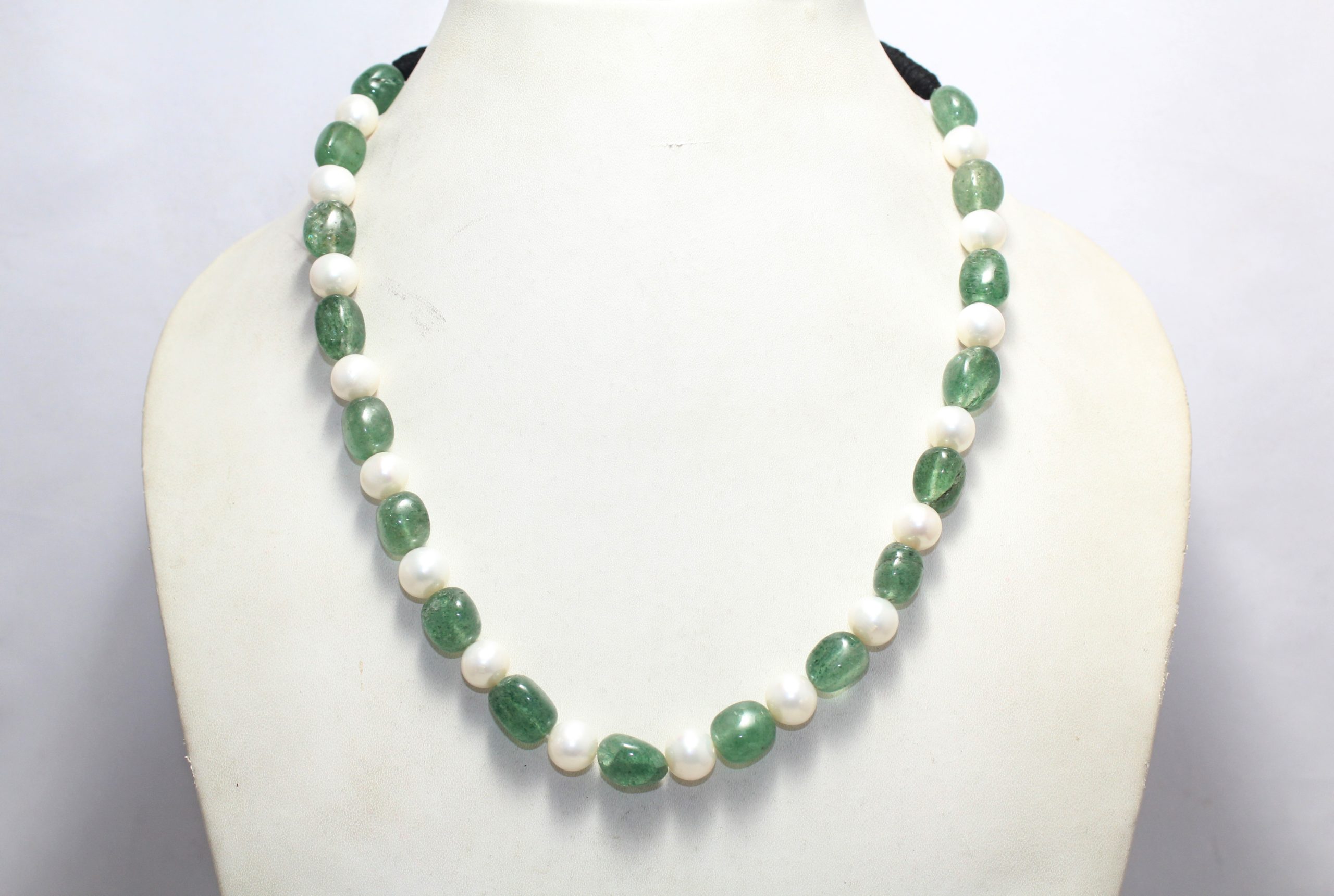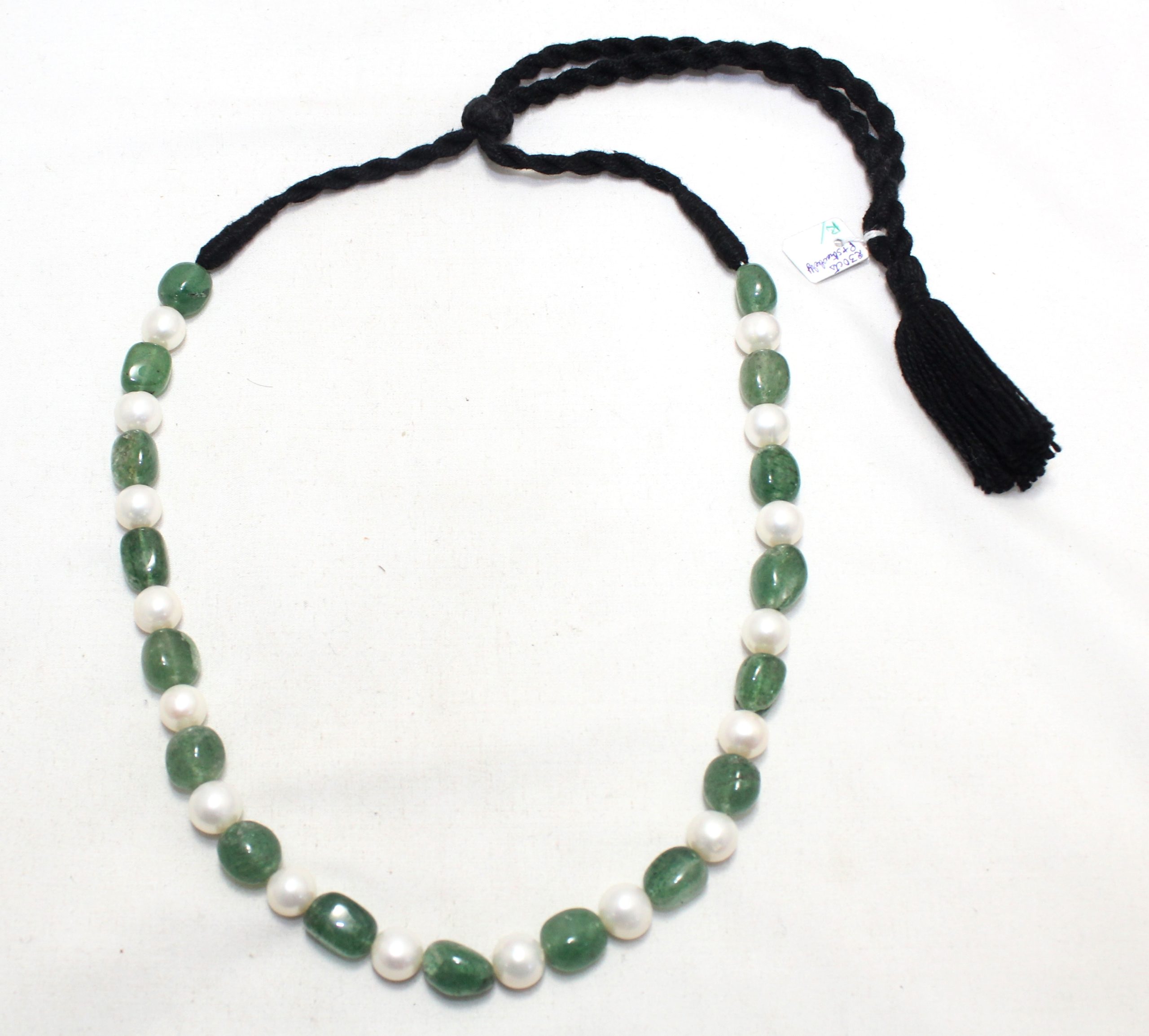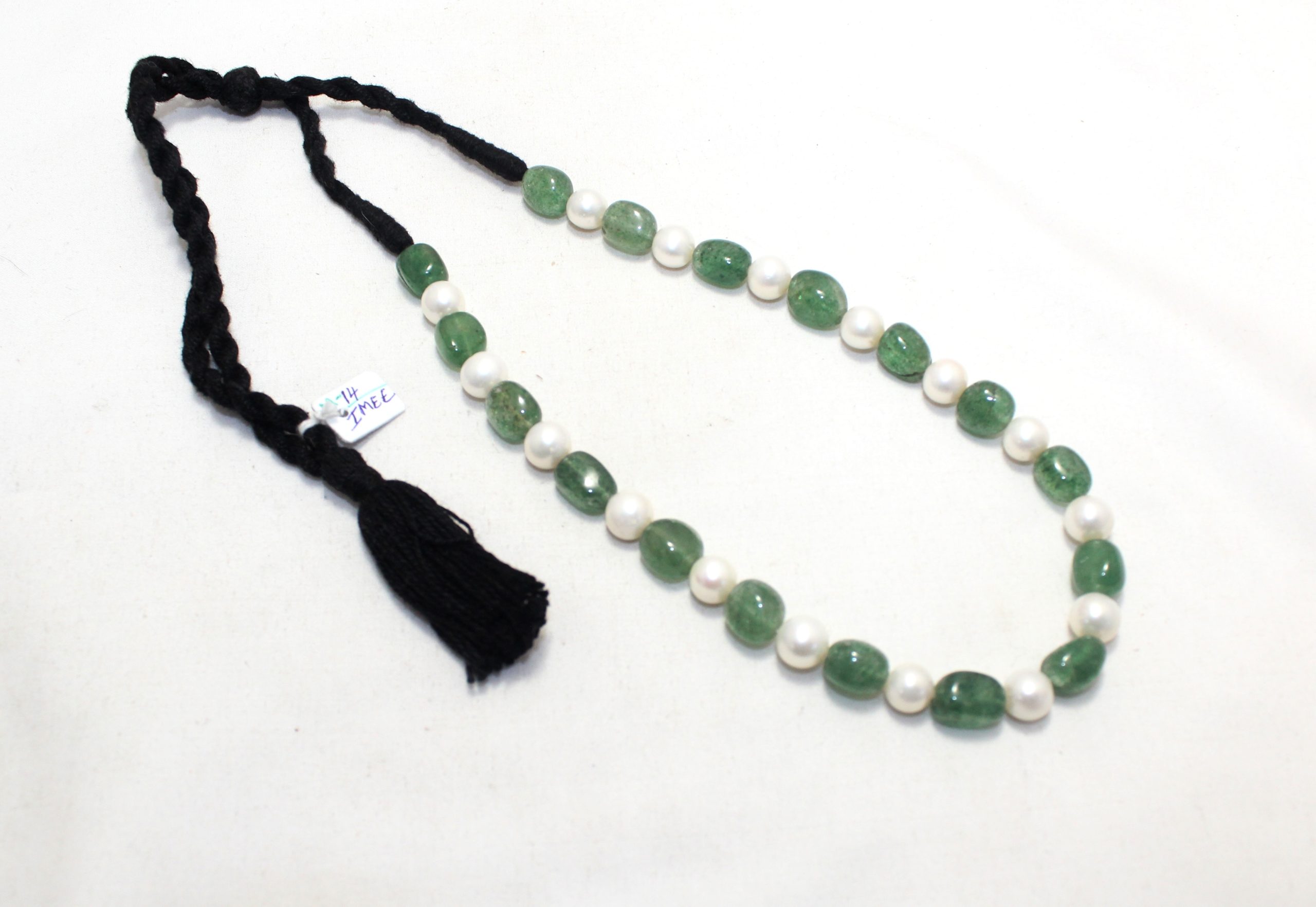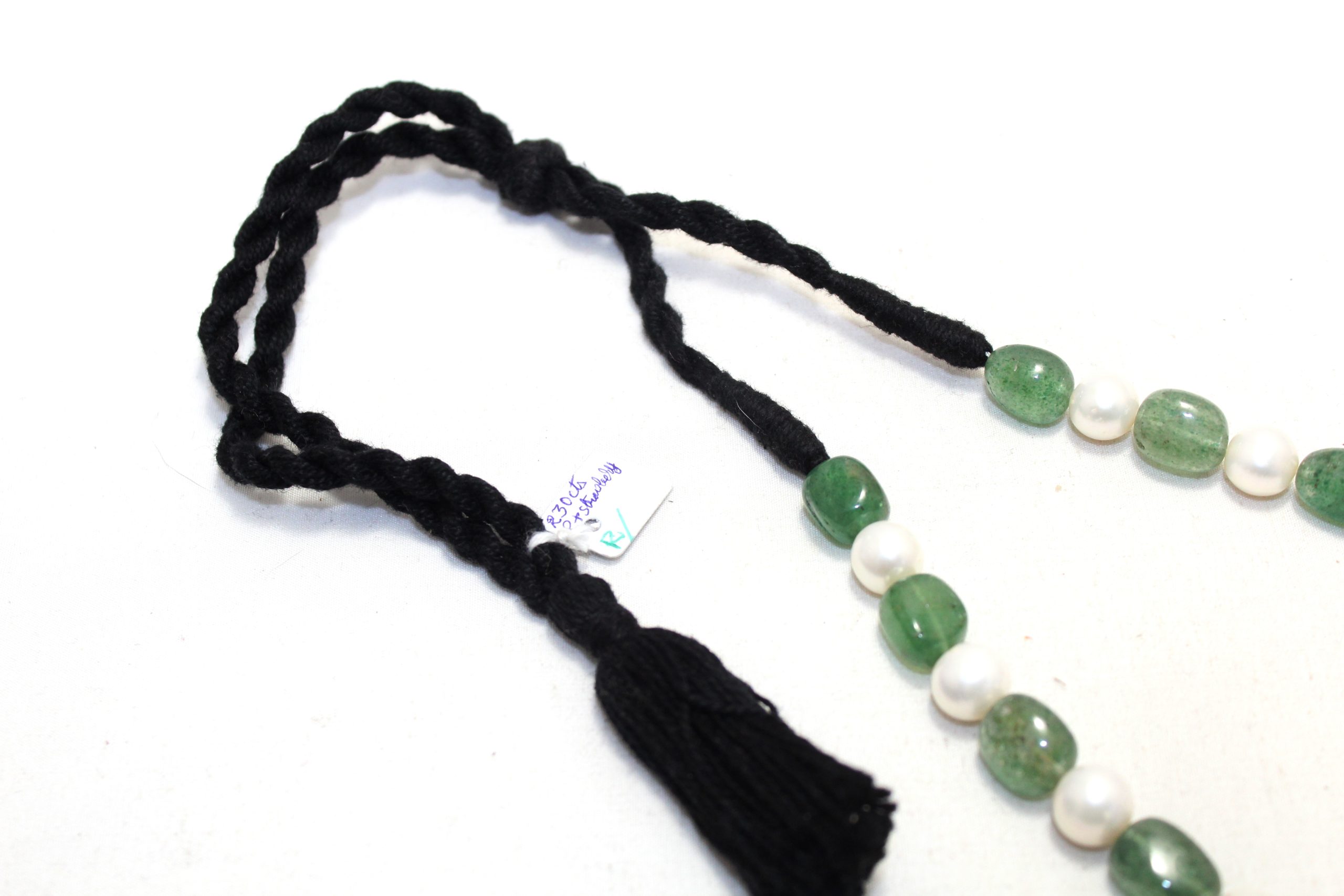 Rajasthan Gems Black Thread Bead Necklace Strand Beaded Natural Green Strawberry Quartz & Freshwater Pearl Gem Stone Gemstone Tumble Beads Tribal Adjustable H160