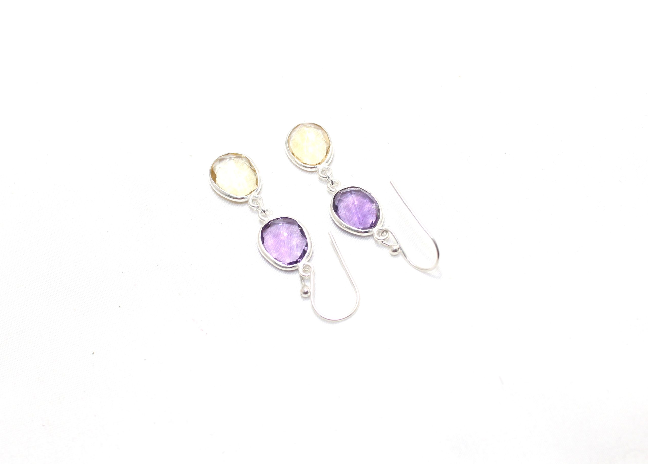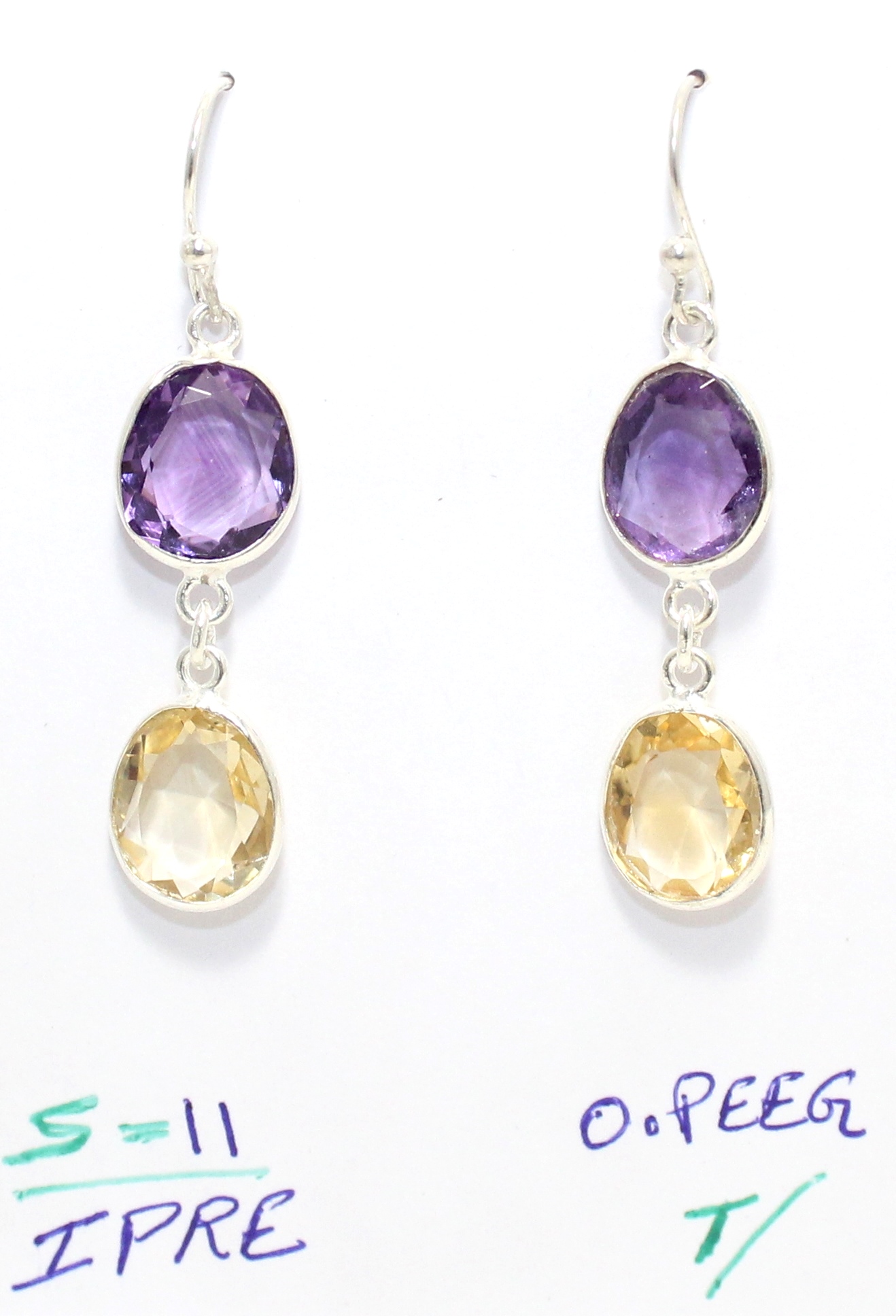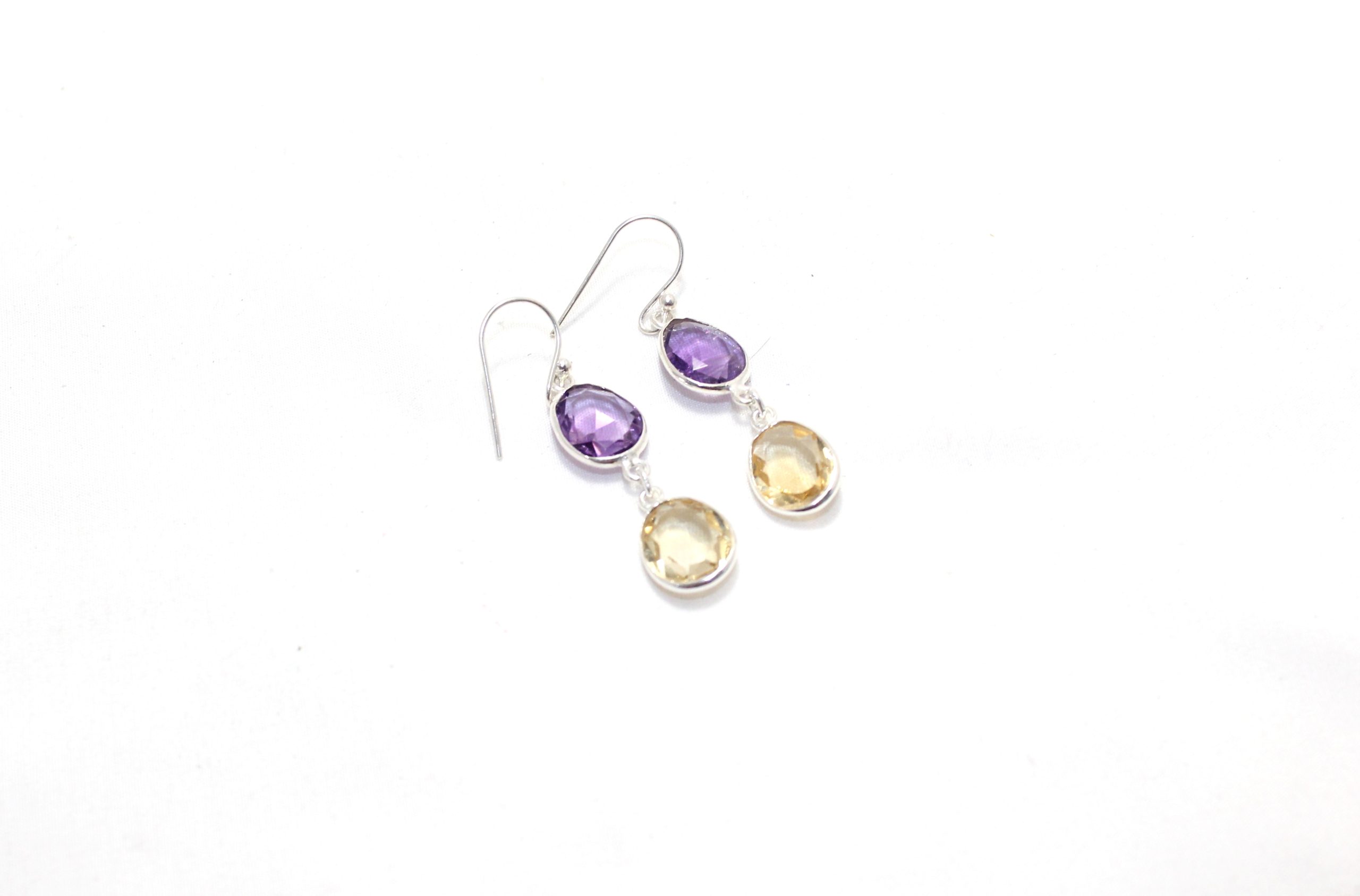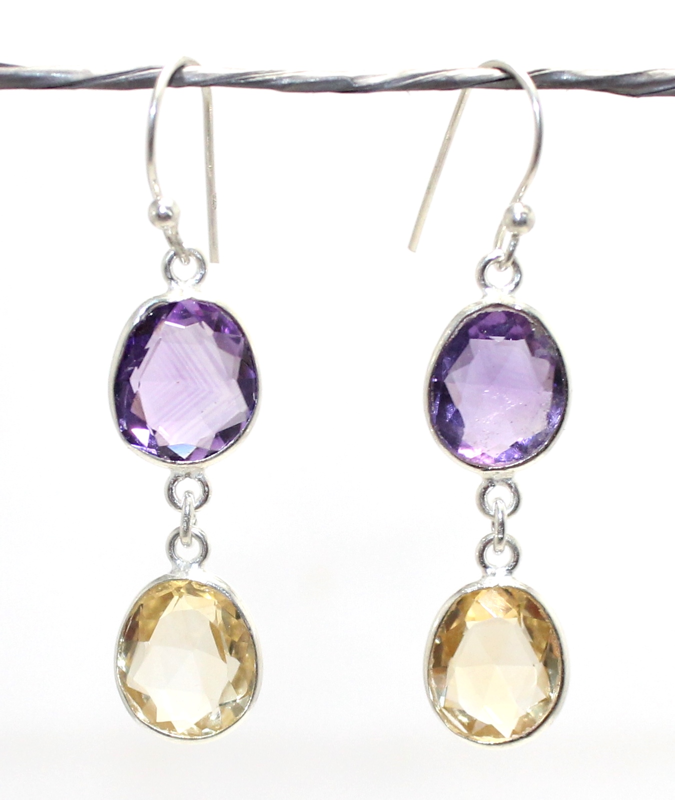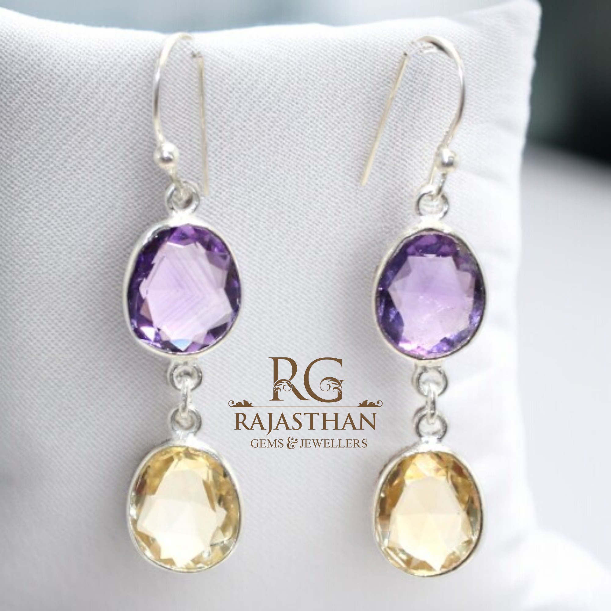 Rajasthan Gems Dangle Earrings 925 Sterling Silver Natural Amethyst & Topaz Gem Stone Handmade Traditional Women Gift G873