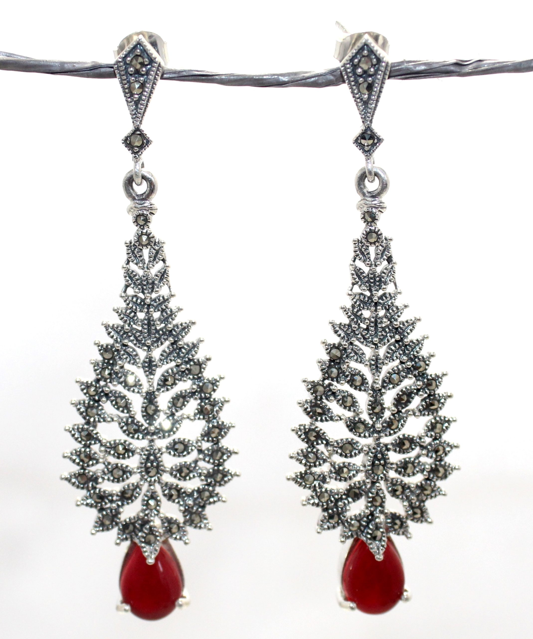 Rajasthan Gems Dangle Long Earrings Silver 925 Sterling Marcasite & Carnelian Gem Stone Handmade Women Gift Designer G294