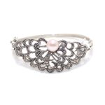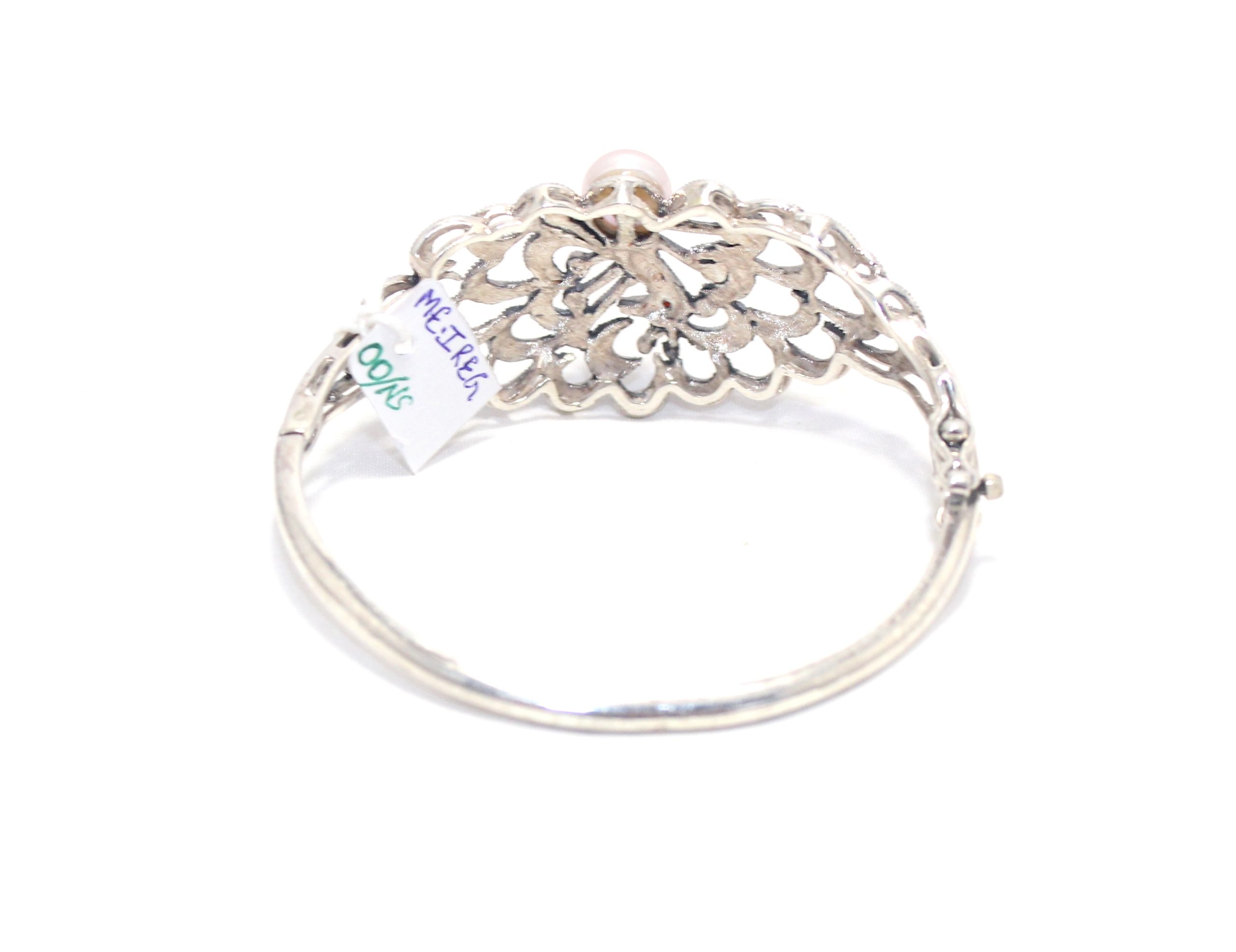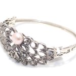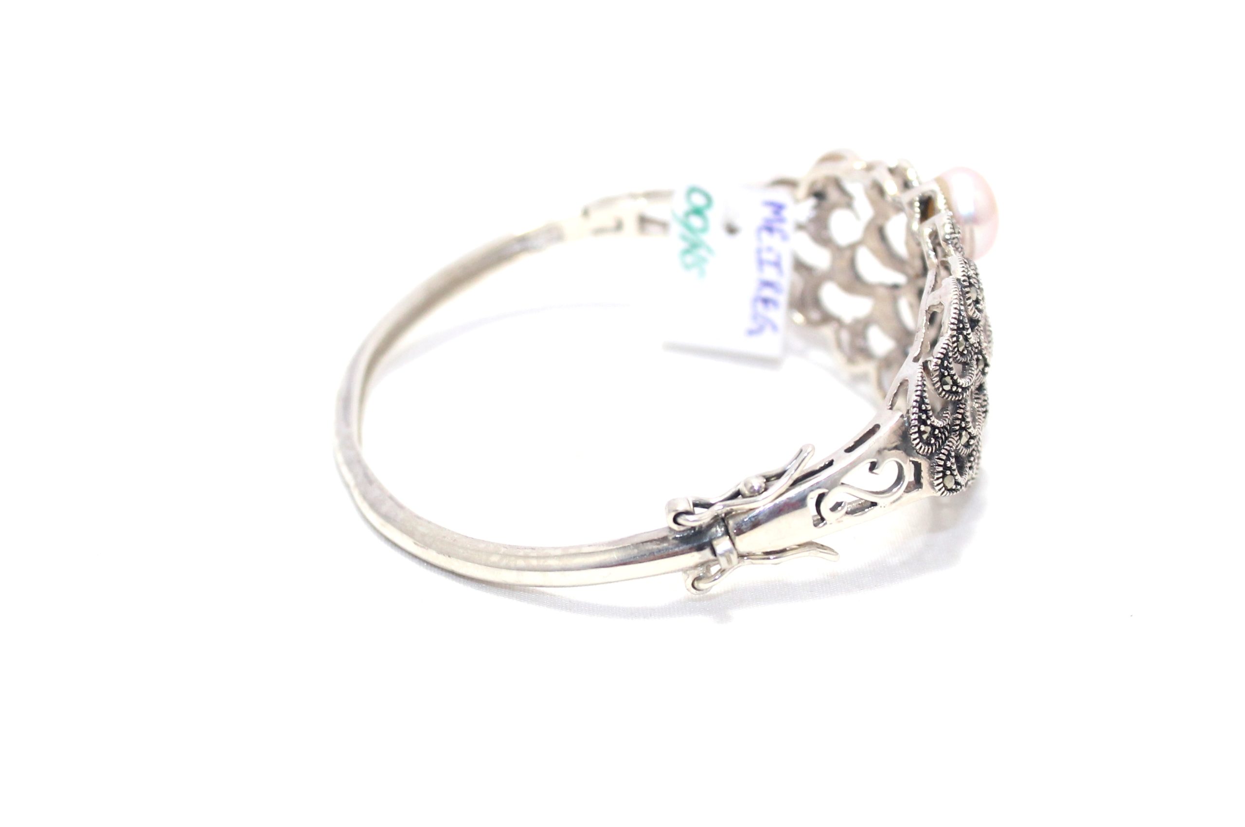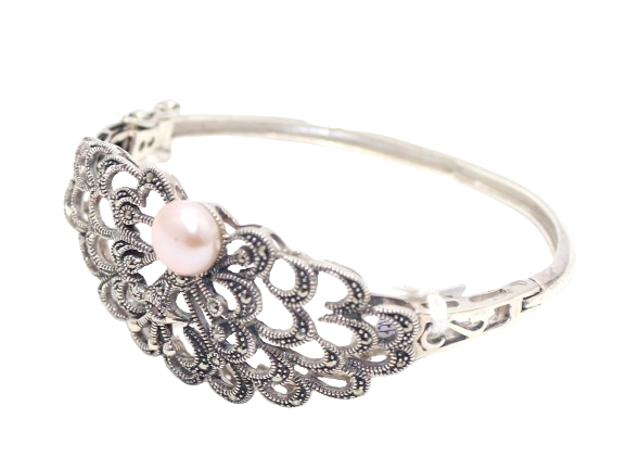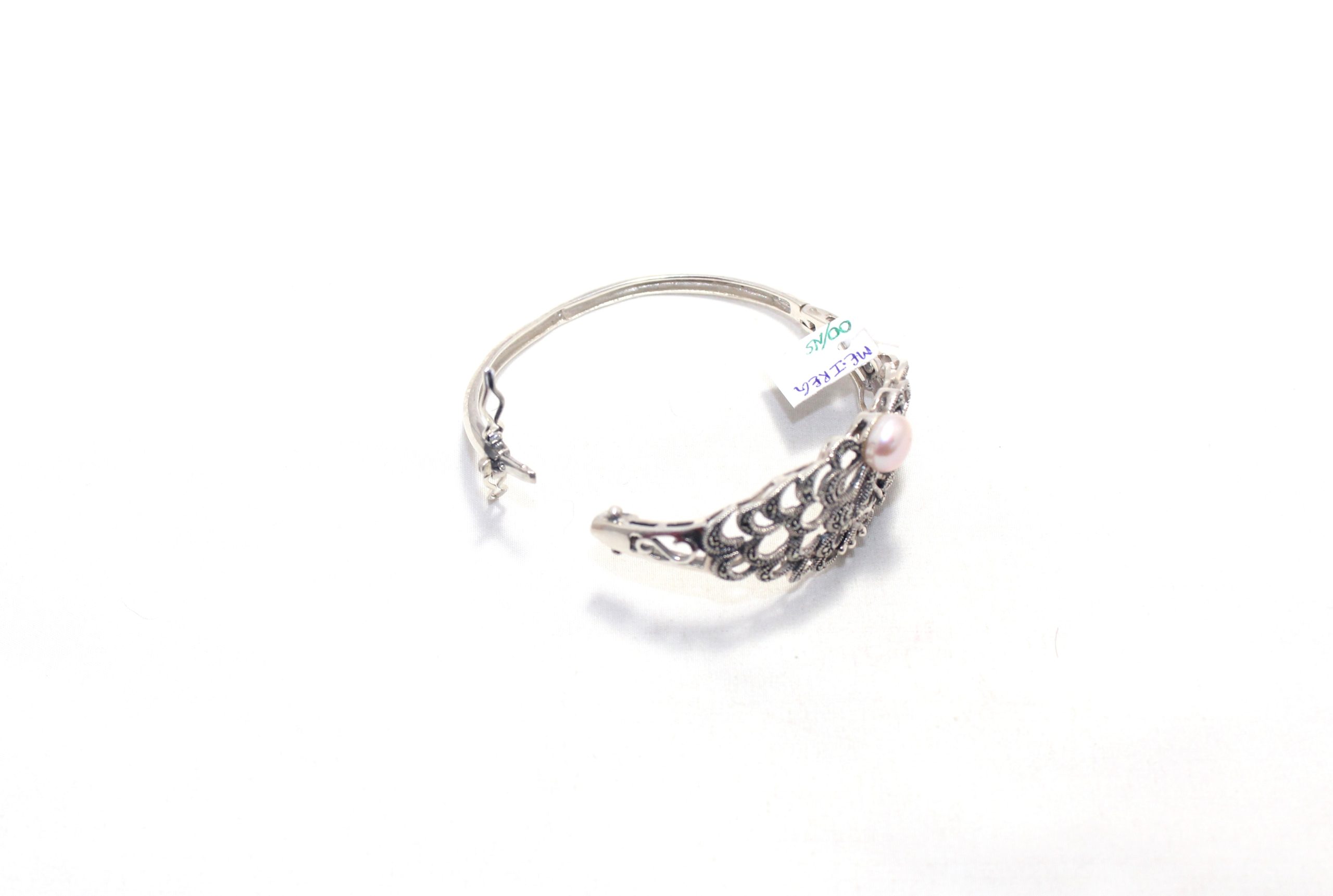 Rajasthan Gems Designer Bracelet Bangle Kada 925 Sterling Silver Womens Marcasite & Freshwater Pearl Stone Handmade Women Gift Openable H540