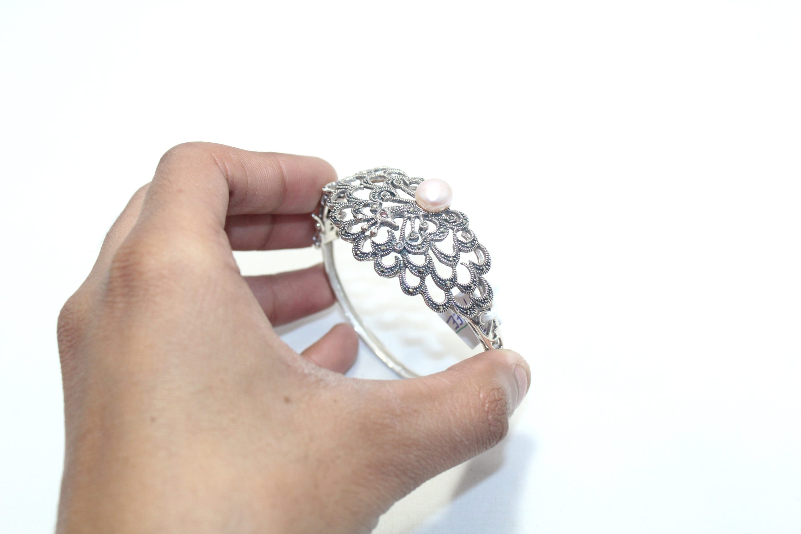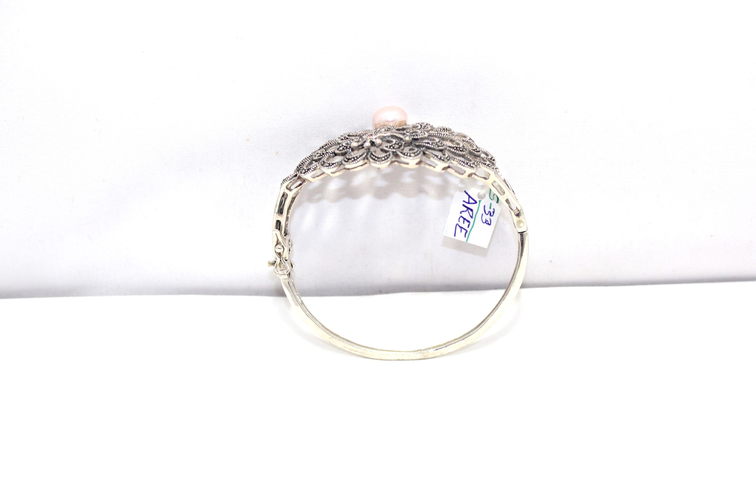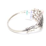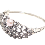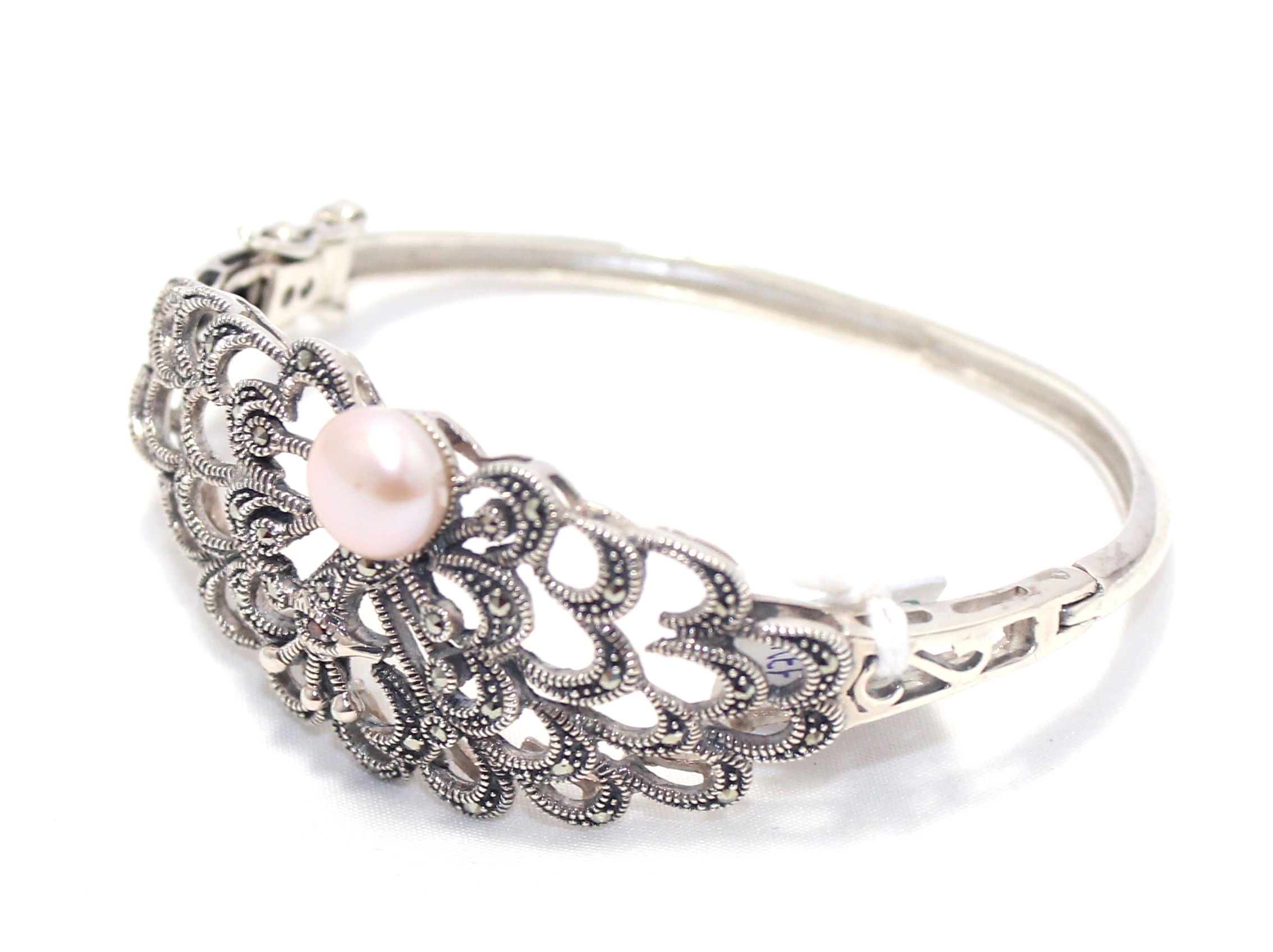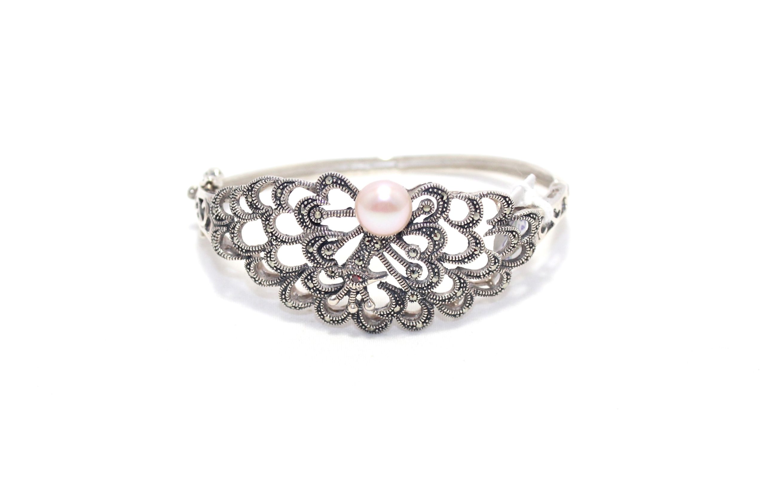 Rajasthan Gems Designer Bracelet Bangle Kada 925 Sterling Silver Womens Marcasite & Freshwater Pearl Stone Handmade Women Gift Openable H540