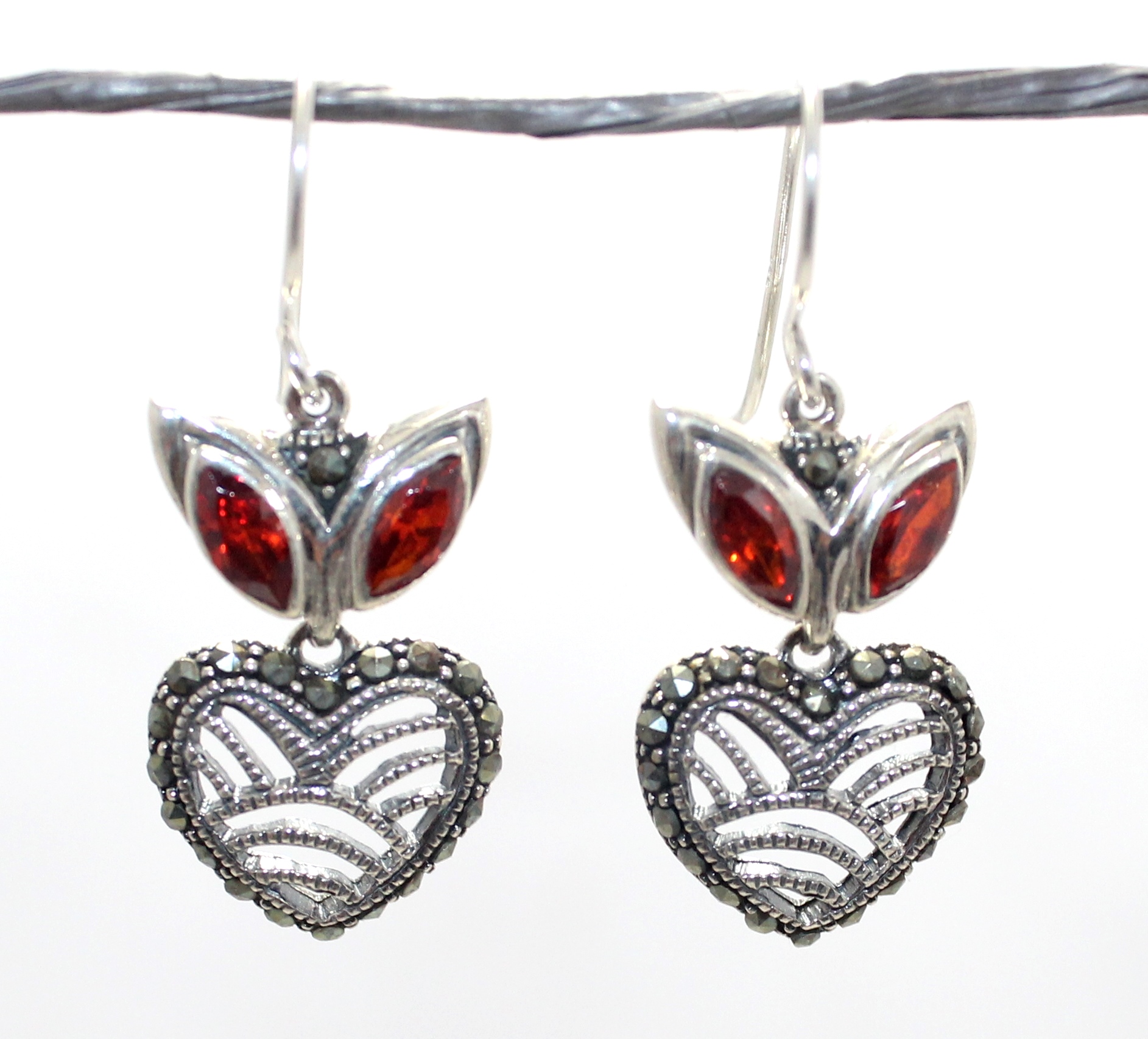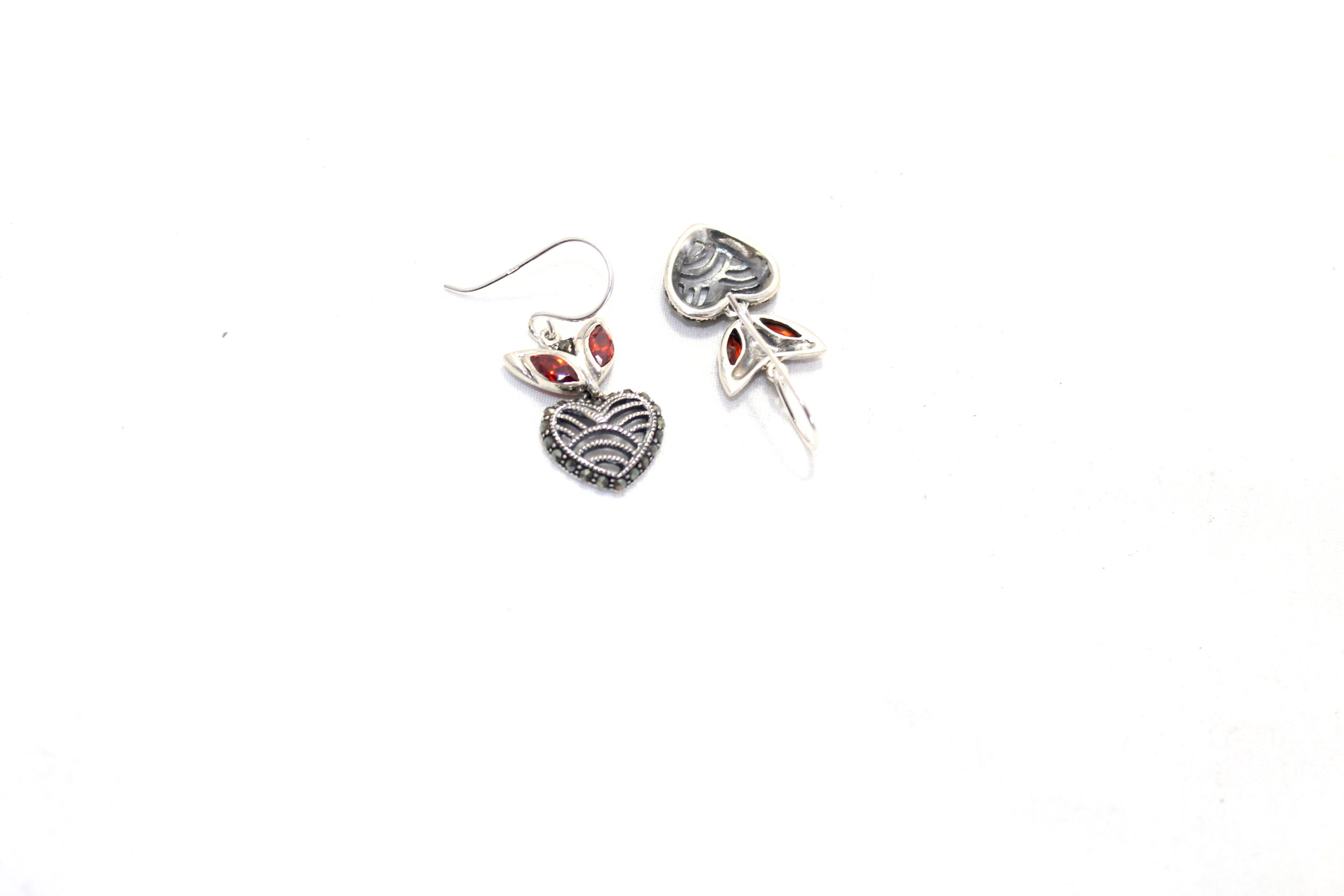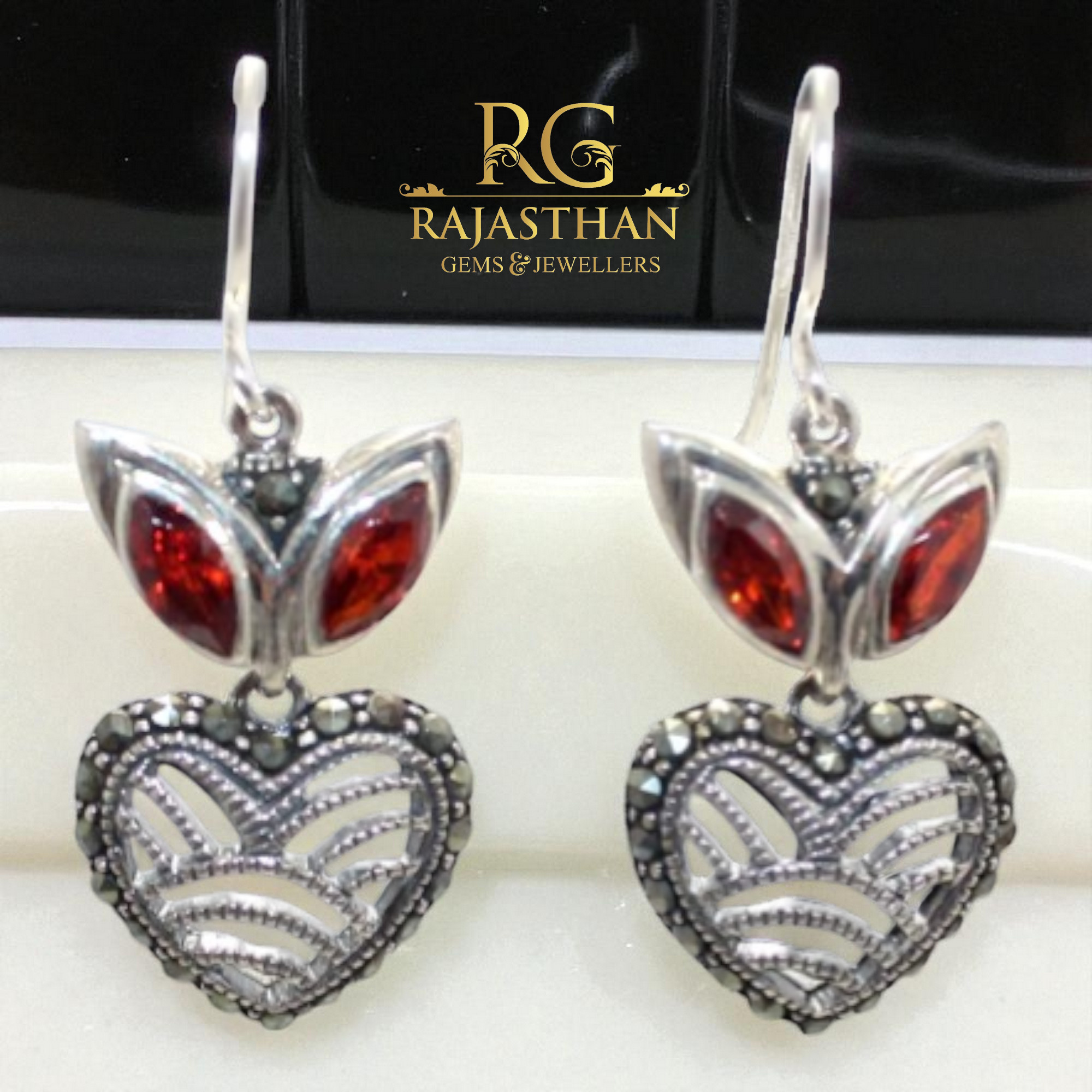 Rajasthan Gems Designer Heart Earrings 925 Sterling Silver Marcasite & Cubic Zirconia CZ Stone Handmade Women Gift G286