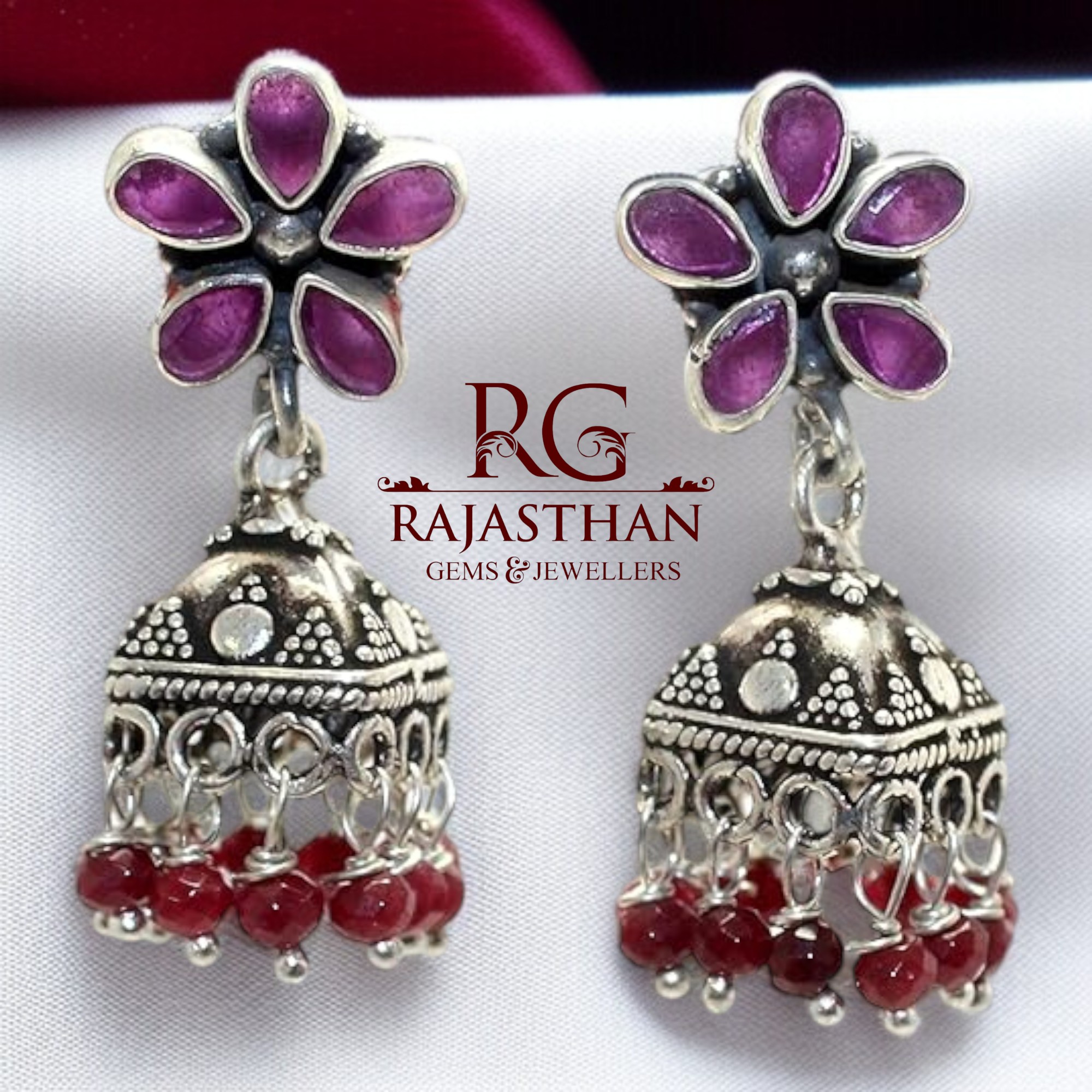 Rajasthan Gems Jhumka Jhumki Earrings 925 Sterling Silver Natural Red Onyx Gem Stone Handmade Women Gift Traditional k651