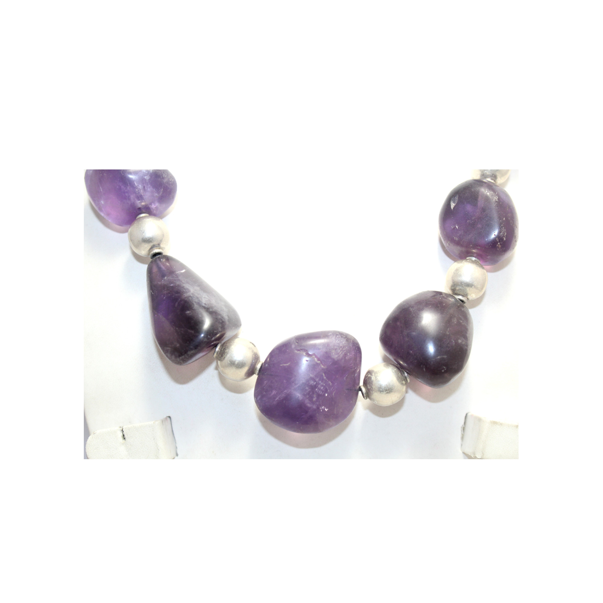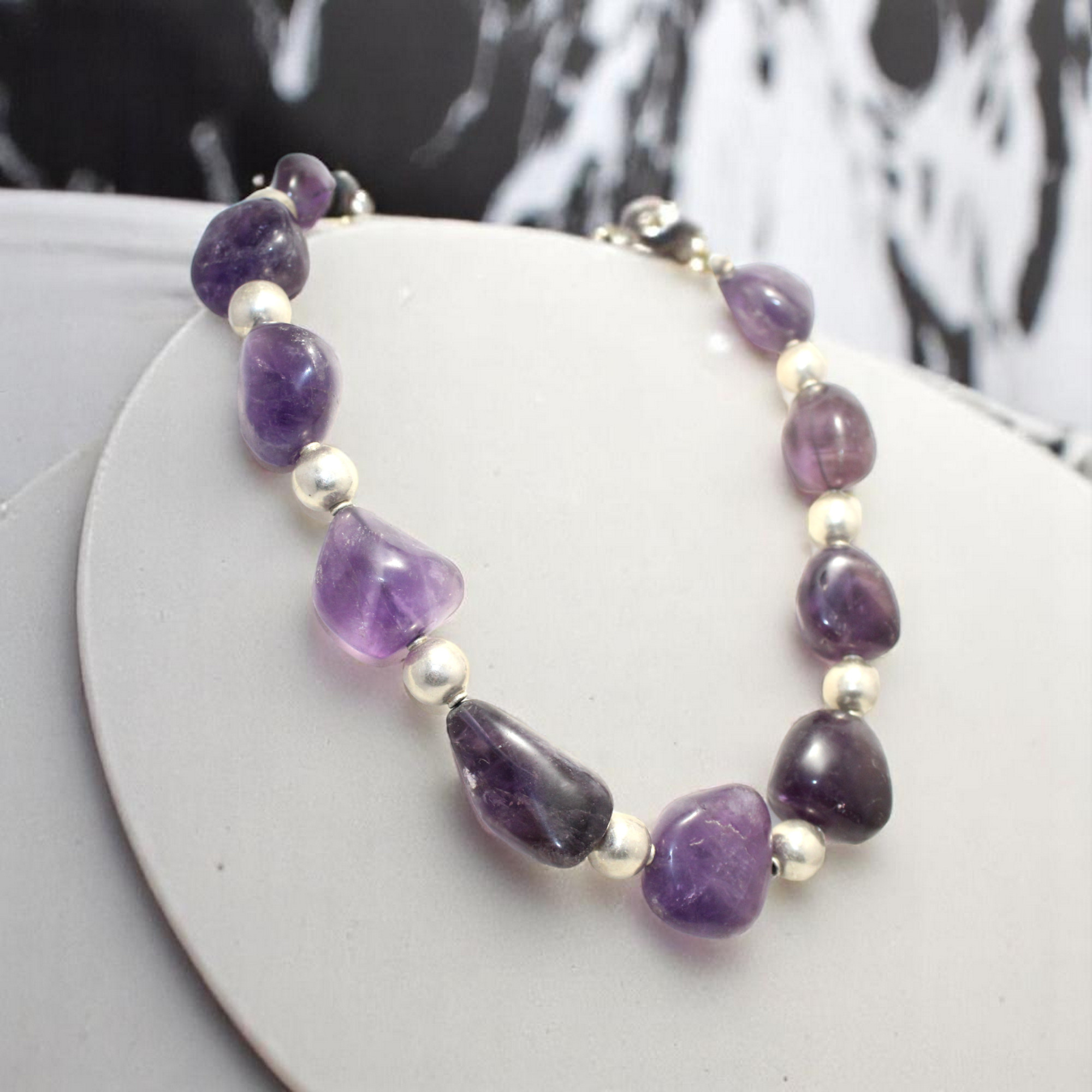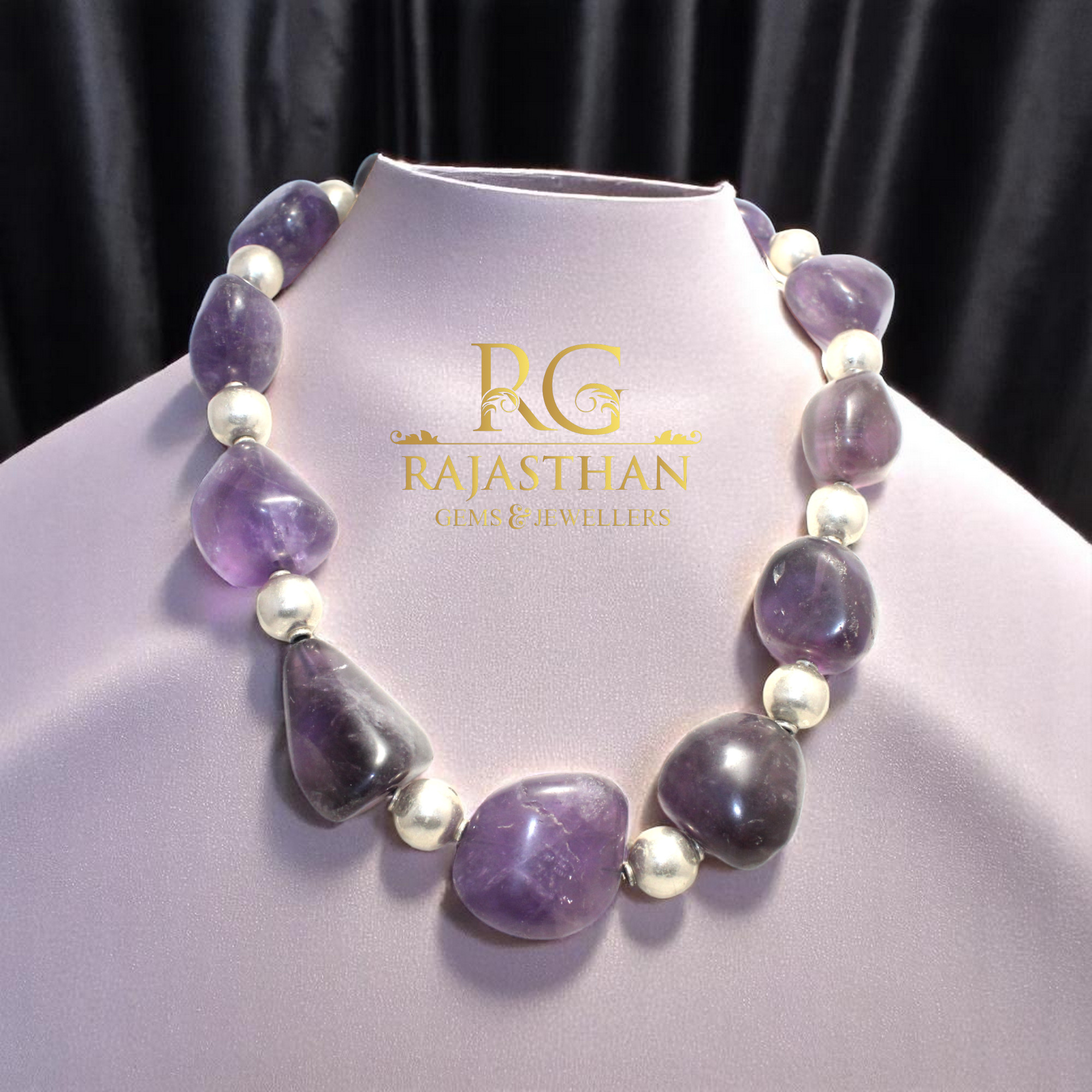 Rajasthan Gems Necklace 925 Sterling Silver Solid Beads Strand String Single Line Natural Amethyst Gem Stone Tumble Bead Women Gift Adjustable Black Thread F572