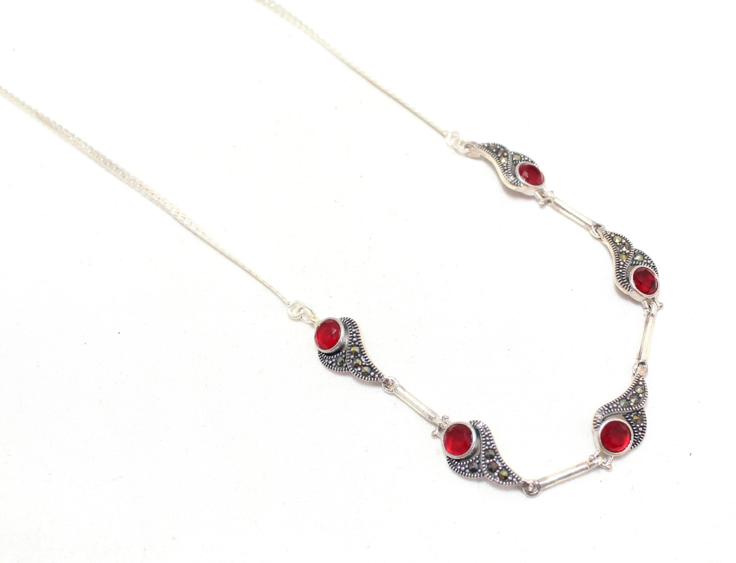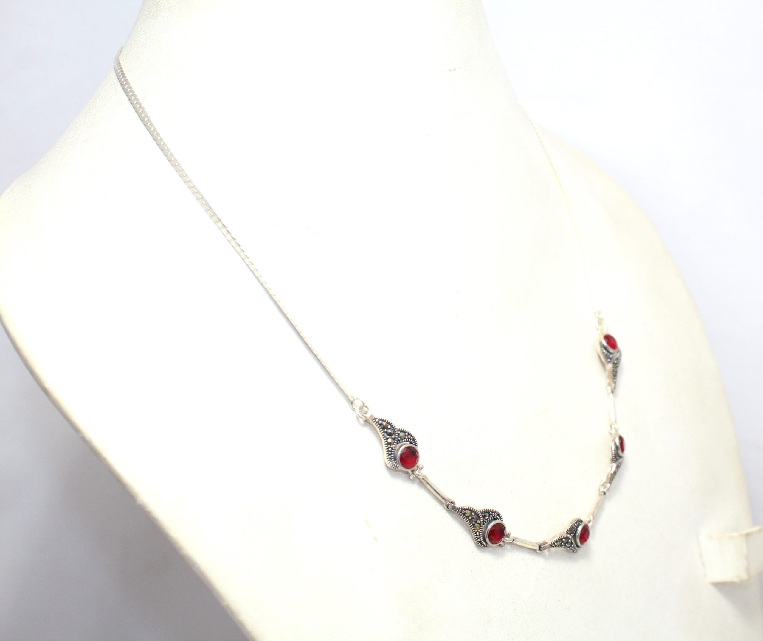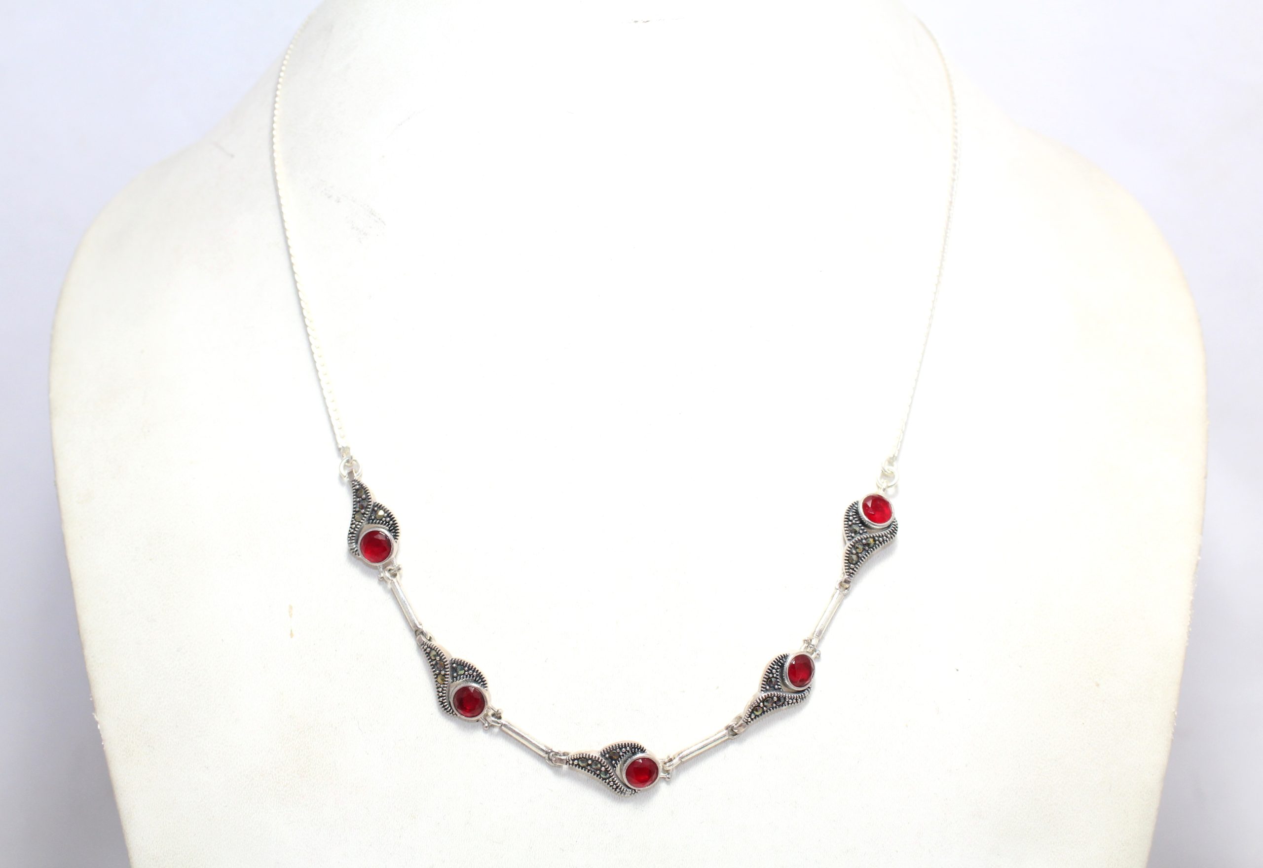 Rajasthan Gems Necklace Earrings Jewelry Set 925 Sterling Silver Designer Marcasite & Red Onyx Gem Stone Handmade Women Gift G515