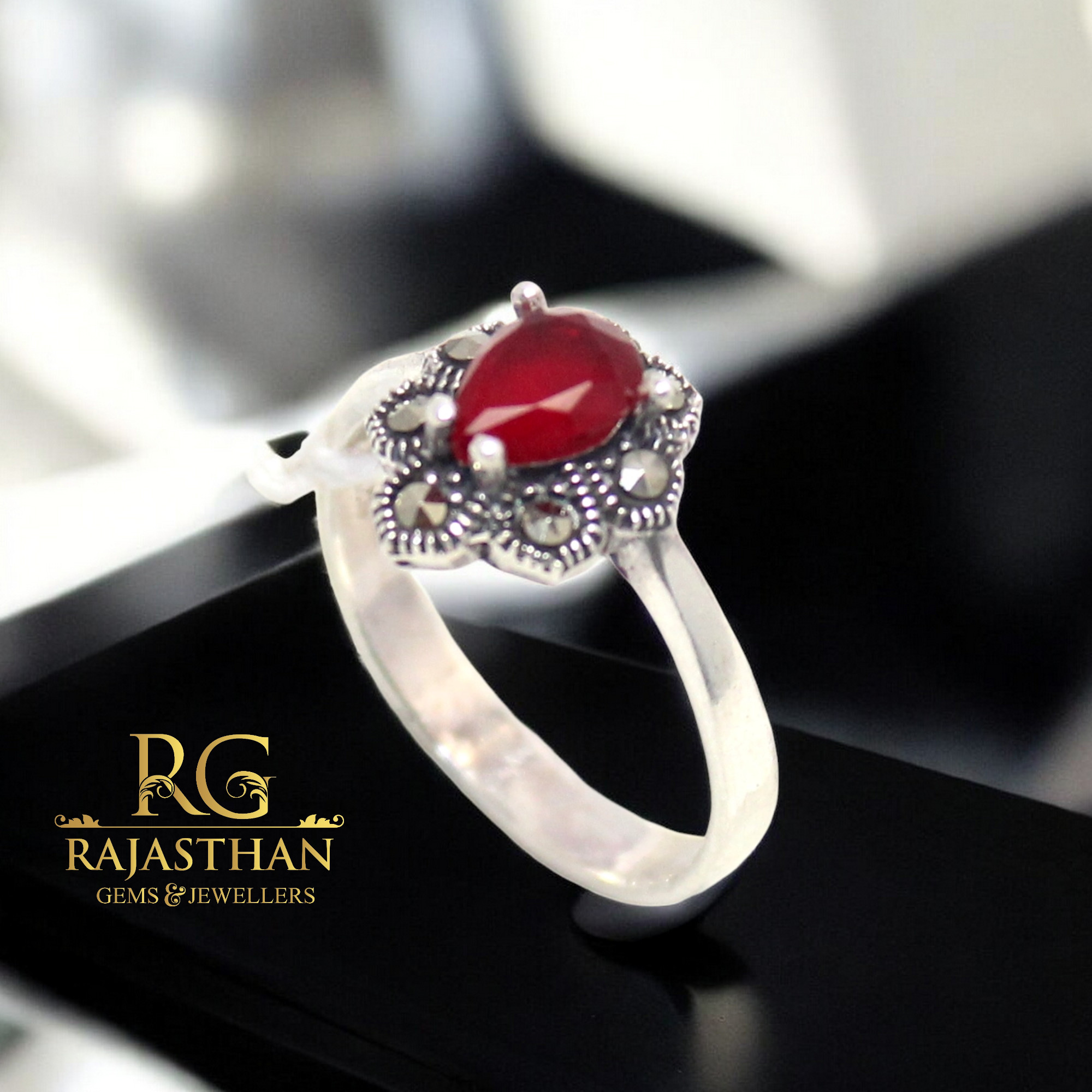 Rajasthan Gems Ring Silver 925 Sterling Women Natural Red Onyx & Marcasite Gem Stone Handmade Gift F453