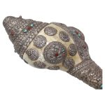 This handcrafted ceremonial conch is mounted with detailed silver craftsmanship, showcasing traditional motifs and fine stone setting. The vibrant natural coral and turquoise stones enhance its antique charm and cultural significance.