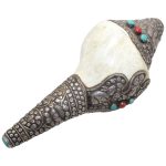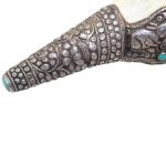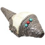 Presenting a beautiful Vintage Tibetan Conch Shell (Shankha) adorned with original precious silver work and set with natural Coral & Turquoise gemstones. This rare collectible piece reflects the rich spiritual and artistic heritage of Tibet and the Himalayan region.