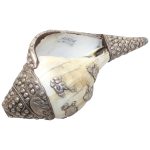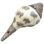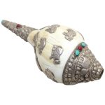 Presenting a beautiful Vintage Tibetan Conch Shell (Shankha) adorned with original precious silver work and set with natural Coral & Turquoise gemstones. This rare collectible piece reflects the rich spiritual and artistic heritage of Tibet and the Himalayan region.